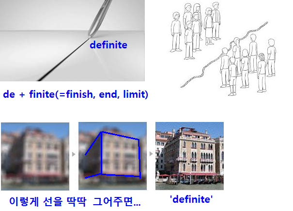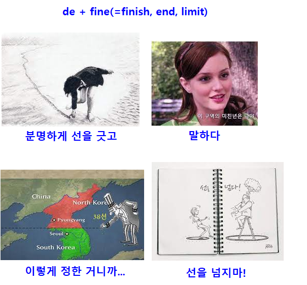 define : de + fine(=finish, limit) 정의하다.