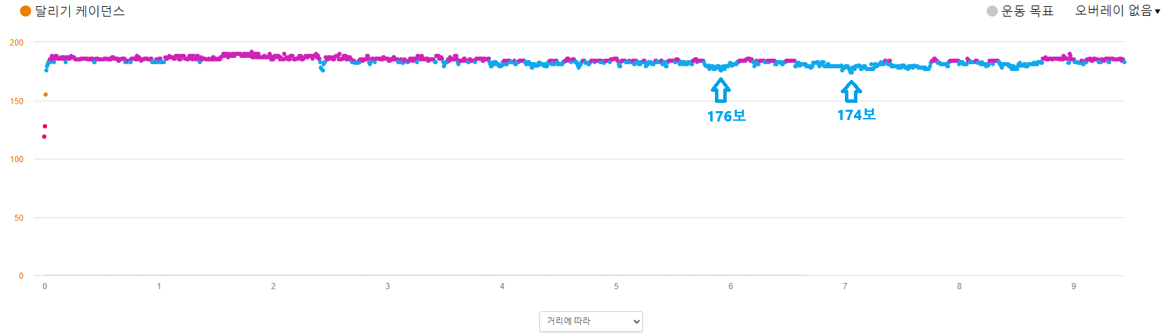 - 이번에 평균 케이던스는 183보가 나왔는데, 후반부에 레이스 속도가 떨어지면서 174~176보로 줄어들기도 했다.