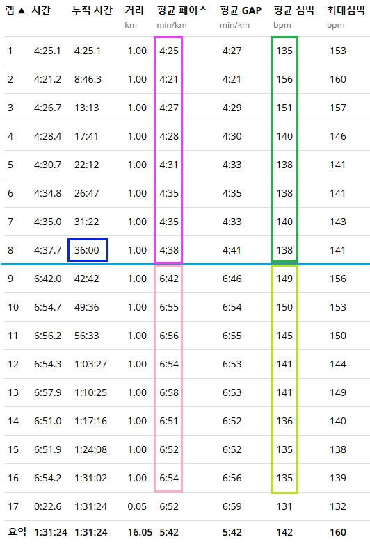 - 전반 8km 구간 소요 시간을 보니 정확히 36분 걸렸던 것으로 확인된다. 36분을 8로 나누면 4.5가 되므로, 8km까지는 정확히 4:30 페이스로 달린 셈이다.