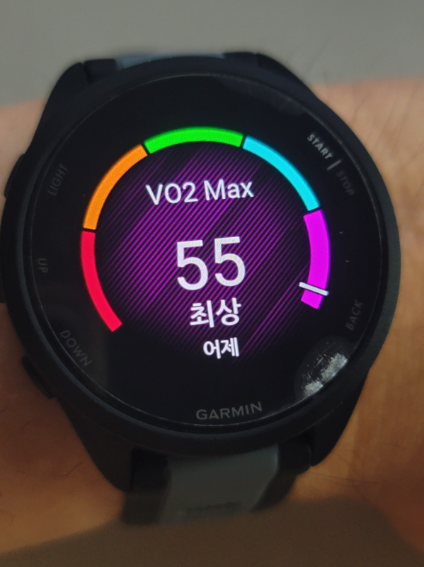 - 최근 VO₂ Max 값은 계속 55를 유지하고 있는데, 눈금이 우측 맨 끝에 가까워졌다가 멀어졌다가를 반복하면서 내 애를 태우고 있는 중이다.