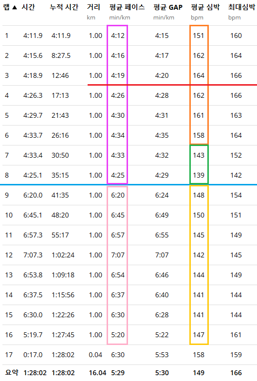 - 그래서, 위 랩 기록을 보면 초반 3km를 고강도로 달렸고, 그에 따라 심박수도 급격히 치솟은 모습이다.