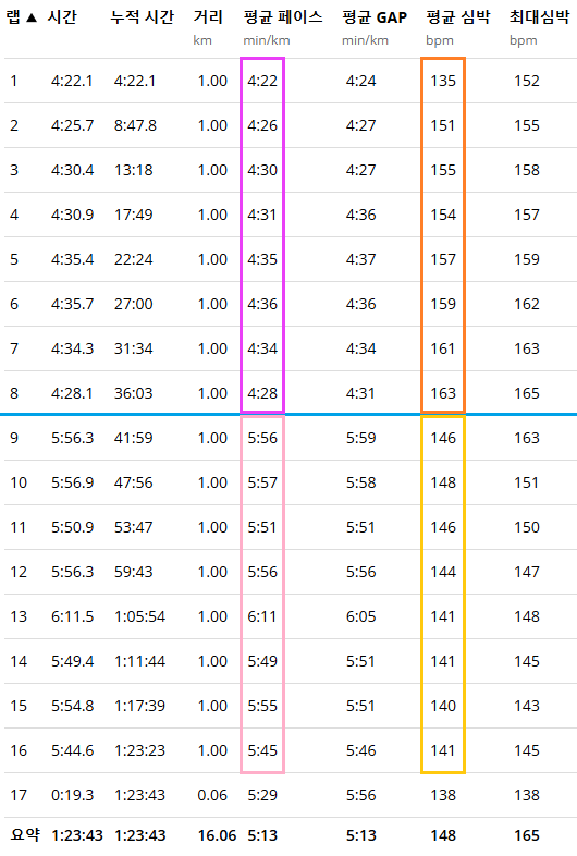 - 어쨌든, 8km까지는 약 4:30 페이스로 템포런을 진행하였고, 나머지 8km는 6:00 페이스로 회복 조깅을 실시하였다.