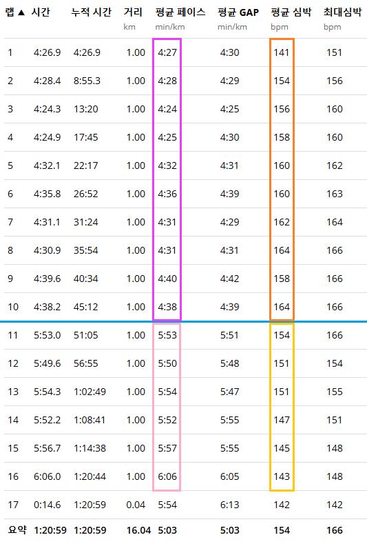 - 결과적으로 오늘 훈련은 10km 템포런에 가까웠고, 후반 6km는 회복 조깅을 한 셈이다.