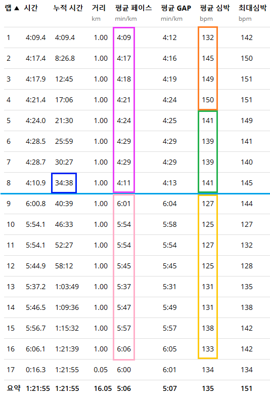 | 8km | 34분 38초 (4:20/km) | 약 33분 00초 전후 (4:07~4:08/km) |