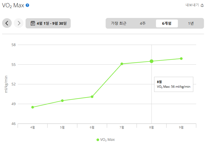 - VO₂ Max 는 지난 7월에 다섯 계단이나 올라 55를 기록하였고, 8월 중순경에 56을 달성하였는데, 현재도 56에 머물러 있다. (그래프가 완만하게 올라가는 중이긴 하다.)