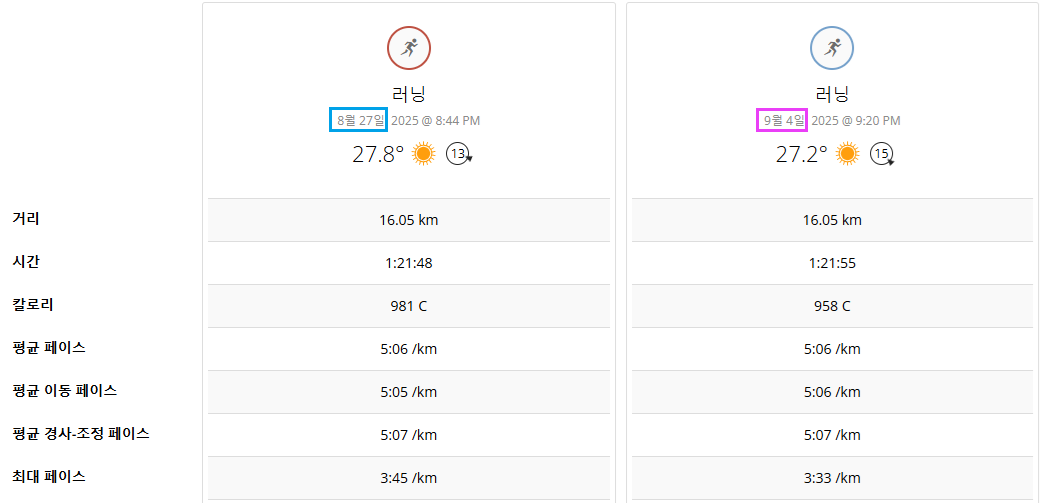 - 같은 훈련을 했던 8월 27일과 비교해보니 평균 페이스가 5:06/km로 동일했다.