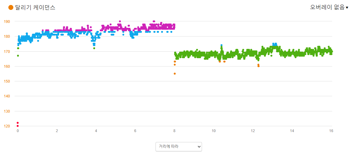 - 전반 8km 템포런 구간에서는 보통 첫 1km 에서 케이던스가 가장 낮게 나오는 경우가 많은데, 오늘도 그러한 패턴이 나타났다.