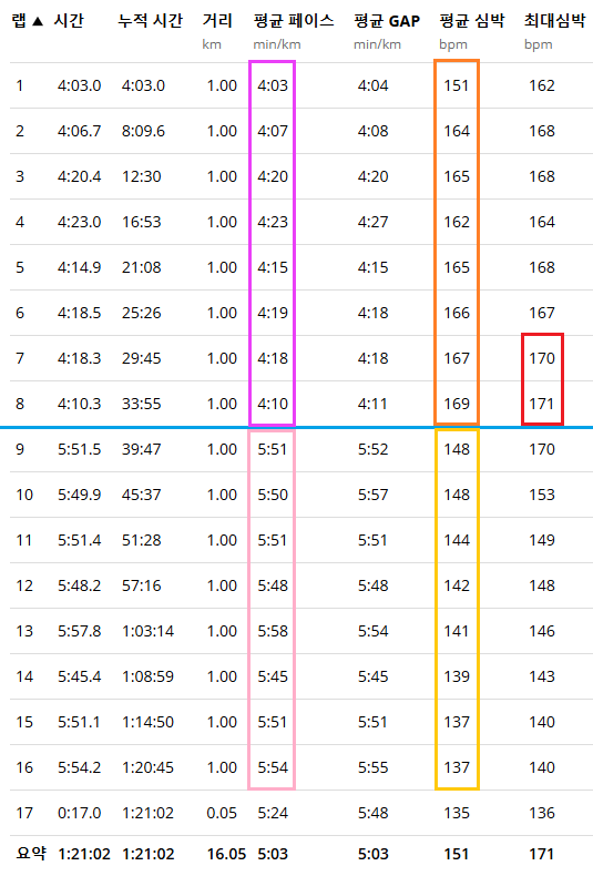 - 출발할 때는 몸이 가볍고, 속도에 대한 감도 없어서 보통 오버페이스로 출발하는 경우가 많다. 또한 초반에는 보폭을 상당히 넓게 가져가다가 점차 케이던스에 신경쓰며 안정된 리듬감을 찾아가는 듯하다.