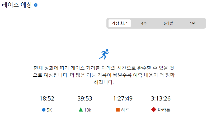 - 현재 레이스 예상 기록을 보면, 10km 기준 40분 벽이 깨졌고, 풀마라톤의 경우 3시간 13분으로 나타난다.