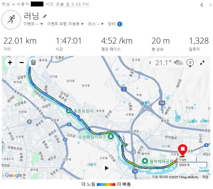 - 오늘은 21.12km를 달렸고, 소요 시간은 1시간 49분 46초였다.- 종아리 쪽에 약간의 근육통이 느껴지고 몸이 다소 무거웠지만, 오늘은 평균 페이스 5:12/km로 속도를 조금 올려보았다. - 코스는 지도