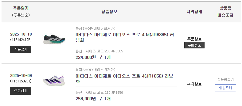 - 나는 보통 260mm를 신고, 러닝화의 경우 265mm도 종종 착용하는데, 아디오스 프로4의 경우 260mm가 잘 맞는 듯하다. (하지만, 겨울에 두꺼운 양말을 신을 때를 대비해서 265mm도 주문하였다.)