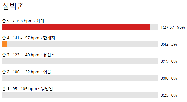 - 위 기준을 참고하면, 스마트워치가 내 하프 마라톤 기록을 바탕으로 나눈 아래 심박존 구분이 얼마나 어이없는 분류인지 잘 알 수 있다.
