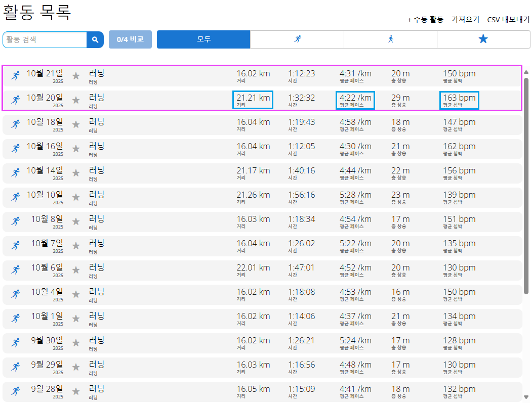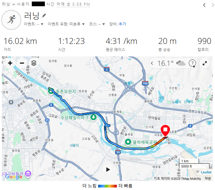 - 10월 20일(어제) 하프 마라톤 기록으로 젖산역치 페이스와 심박수를 알 수 있었고, 10월 21일(오늘) 16km 기록으로 젖산역치를 검증해 보는 것도 가능하다.