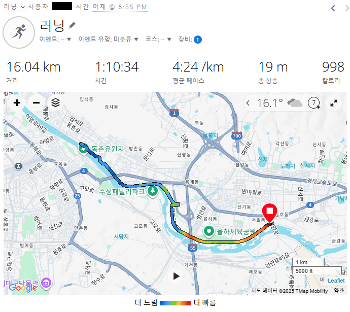 '청도반시 하프마라톤'을 3일 앞두고 오늘은 16km를 4:24 페이스로 달렸어.