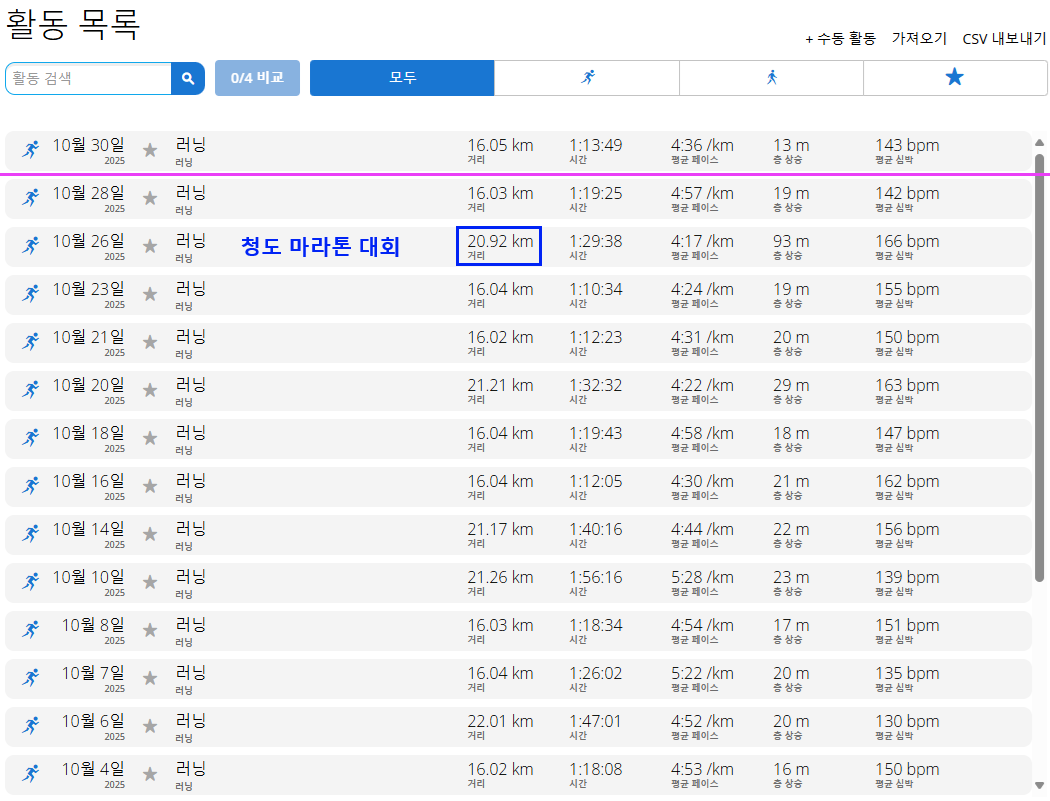 | '청도반시마라톤대회' 하프 기록 01:29:33, 평균 4:14 페이스 (1) | 2025.10.26 |