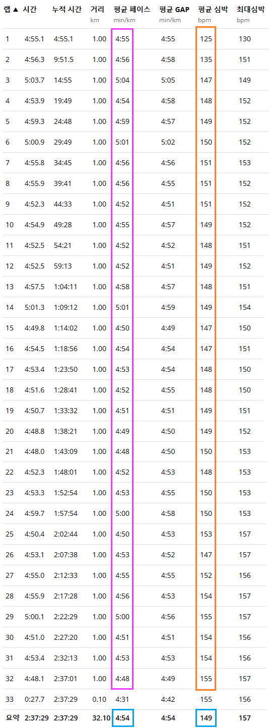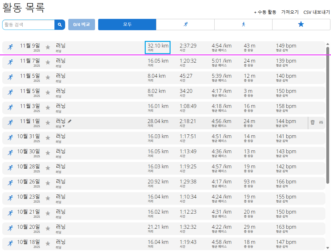- 11월 9일 오늘은 32km 롱런을 하였고, 시간은 2시간 37분이 걸렸다. (평균 4:54 페이스)