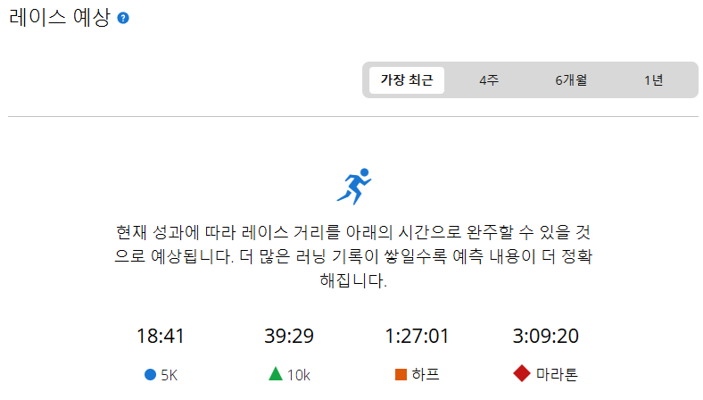 - 최근 스마트워치가 추정하는 레이스 예상 기록은 위와 같다.