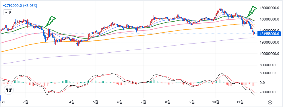 - 빨간색 3번 저점 부근에서 단기 바닥이 형성되더라도 전체 큰그림 상으로 보면, 2023년 말부터 이어져온 상승 추세가 점점 꺾이고 있는 상황으로, 언젠가 원형 천장이 완성되면 꽤 오랜시간 암흑기가 도래할 수도 있다.