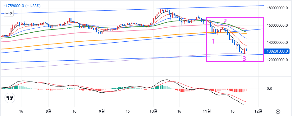 - 중기 추세 추종자라면 아직은 관망할 때이고, 분홍색 1, 2, 3번 같은 단기 사이클을 타는 투자자라면 지금은 반등을 노려볼 만한 자리다.