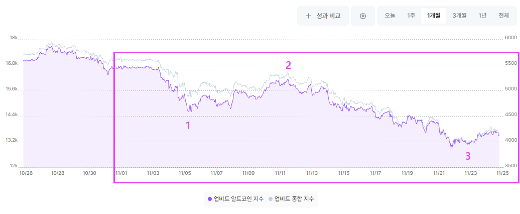 - 업비트 종합 지수와 알트코인 지수를 보면, 전체 흐름이 거의 비슷하다고 볼 수 있다.