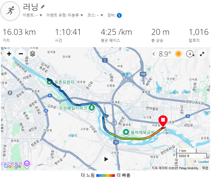 - 원래는 이번달에 템포런을 많이 해서 젖산역치(4:14 페이스)를 더 끌어올리고 싶었는데, 이제 날씨가 추워서 그런지 콧물도 질질 흐르고 바람도 많이 불어서 빠르게 달리기가 쉽지 않다.