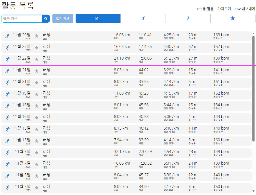 - 11월 22일은 21km를 조깅 페이스로 달렸고, 27일은 여유있는 마라톤 페이스로 달렸으며,