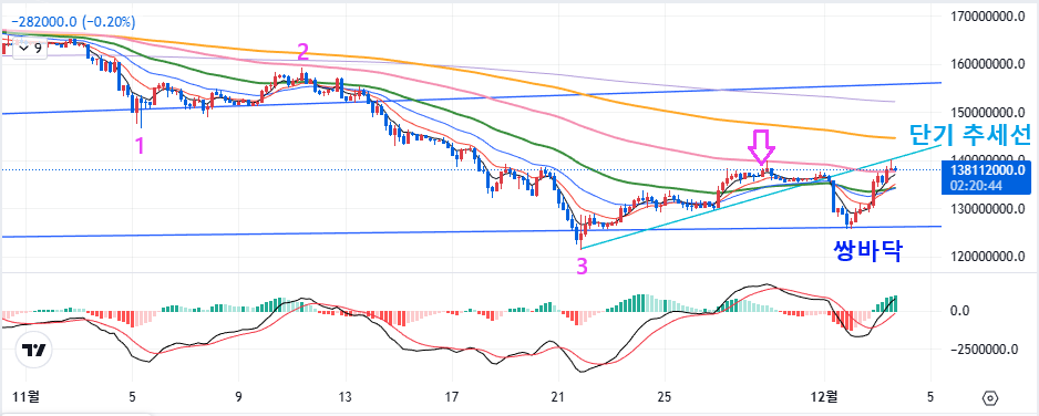 - 이번에는 비트코인 4시간 봉으로 확대해 본 모습이다.