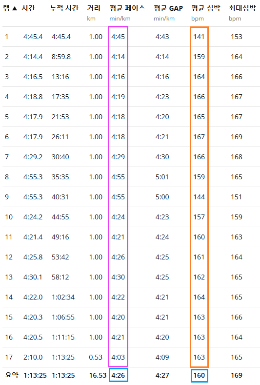 - 평균 4:26 페이스가 나왔고, 평균 심박수는 160bpm 이었다.