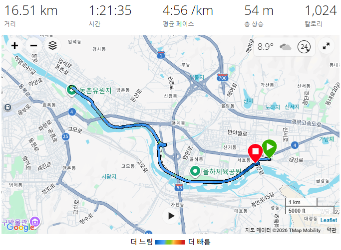 - 오늘도 16km를 달렸는데, 전반에는 템포런을 후반에는 조깅을 실시하였다. (양극화 훈련)