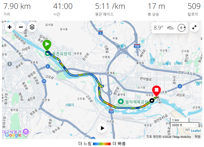- 의도하진 않았지만, 전반 4:11 페이스와 후반 5:11 페이스라는 재밌는 결과가 나왔다.